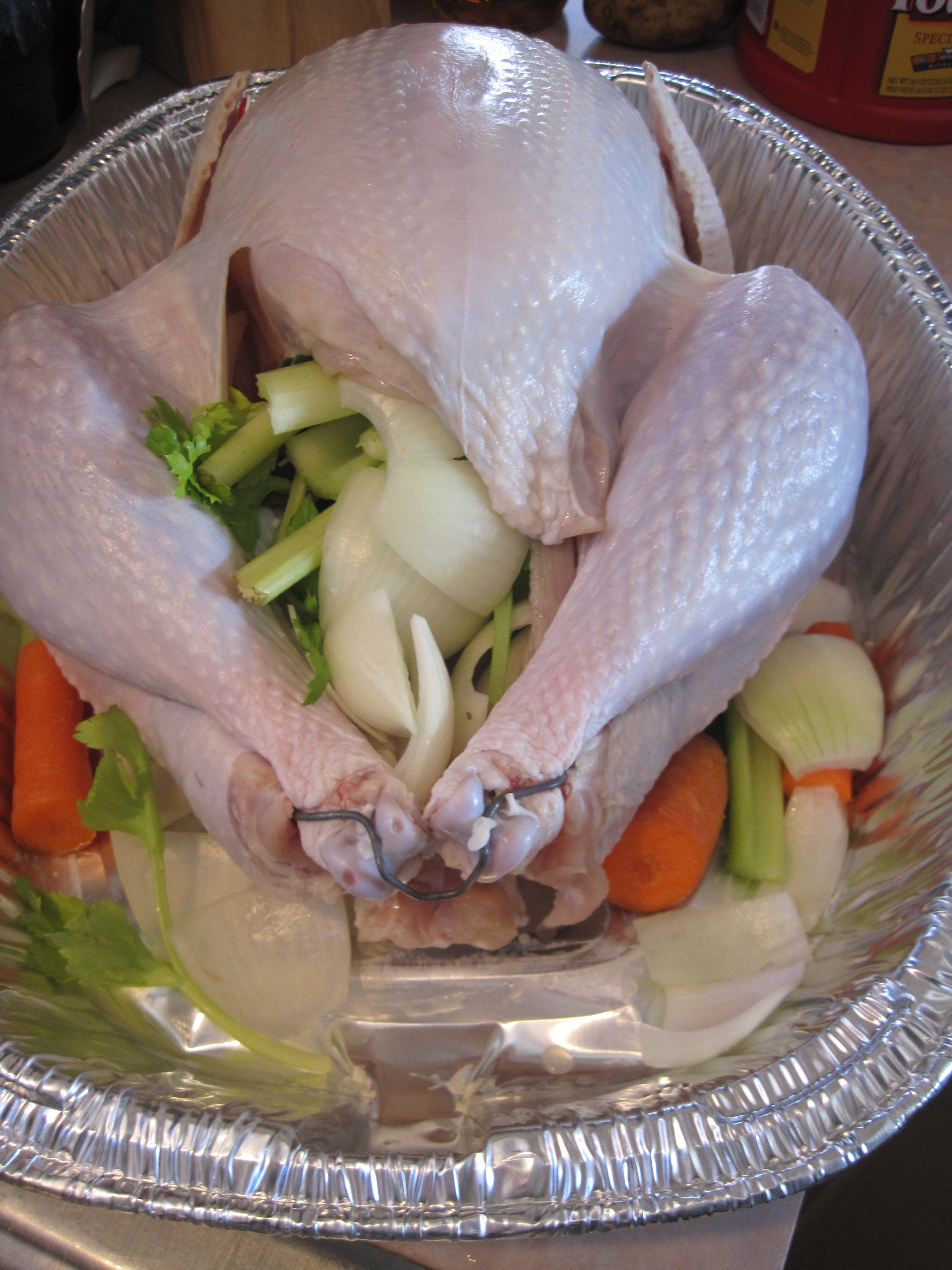 Ok. That’s it. Soak your bird about 1 hour per pound (although I’ve read other recipes that say at least 24 hours). I get wine drunk and put it in around 10pm the night before, and by noon it’s ready to go in the oven. Turn it a few times if possible.
